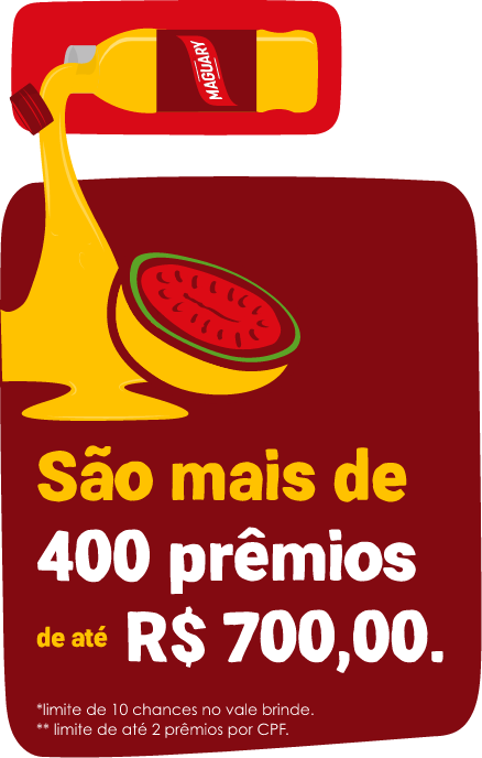 A Maguary - Sabor que Vale é um “Sorteio”, realizado pela Empresa Brasileira de Bebidas e Alimentos S/A pessoa jurídica de direito privado inscrita no CNPJ nº 07.604.556/0001-36, com sede na Av. Paulista, número 1842, complemento: andar 17 EDF. Cetenco, Bela Vista, São Paulo – SP, CEP:01310-945, autorizada pelo certificado SPA/MF Nº 05.045454/2025, conforme regulamento disponível www.maguarysaborquevale.com.br